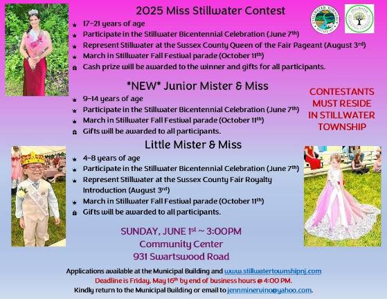 Applications are available for the 2025 Miss Stillwater Contest, which will be held at 3 p.m. June 1 at the Community Center, 931 Swartswood Road.