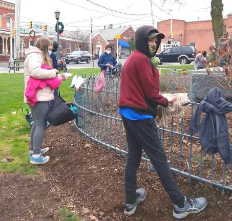 Newton. Scouts from Troops 91 and 151 and their families converged on the Green in Newton for a family service project. After collecting new and gently used coats, hats, gloves, mittens, and scarves, they “dressed” the fence so that those in need could help themselves to warm garments. (Photos provided)